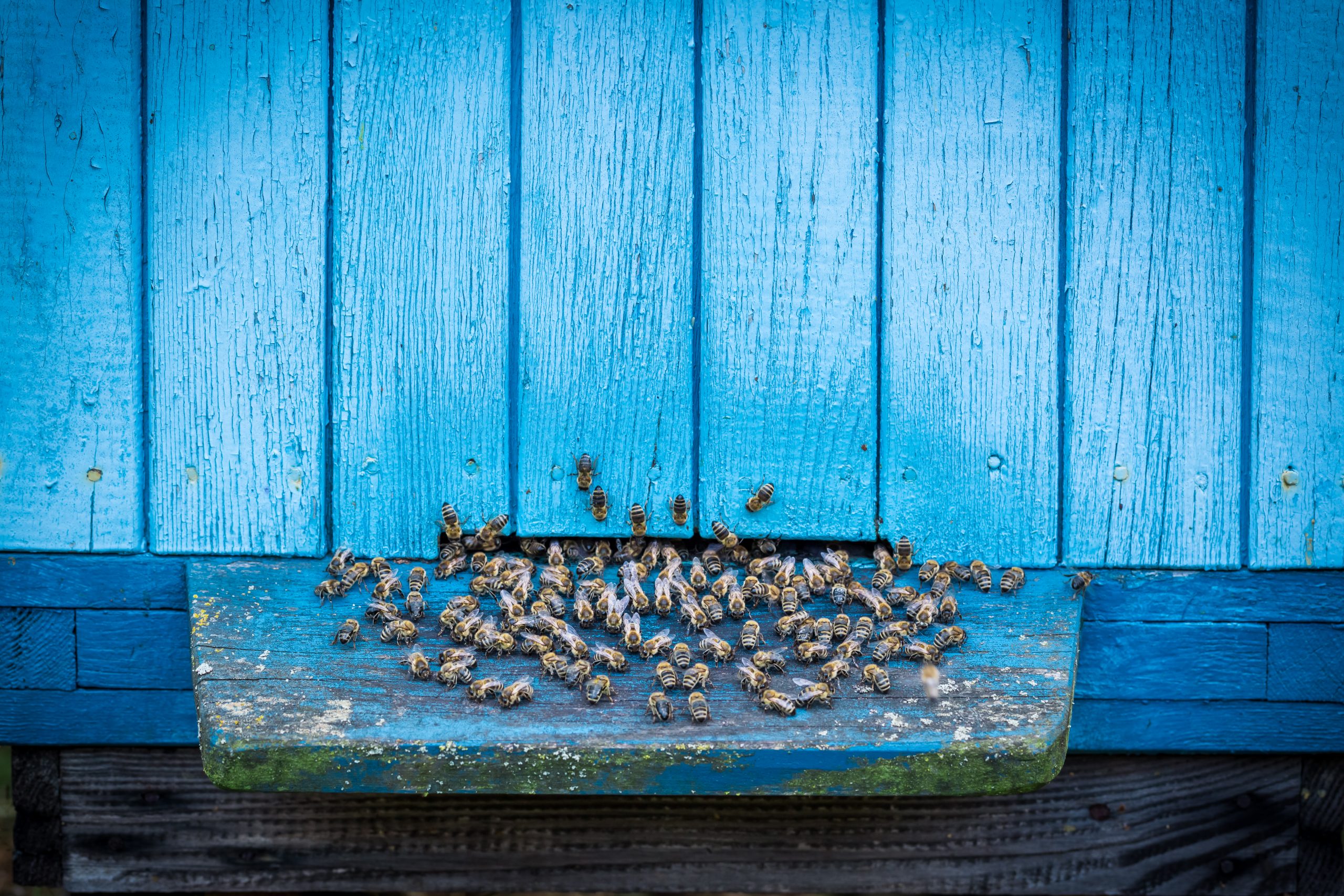 Closeup of blue beehives with bees